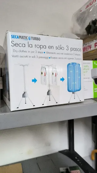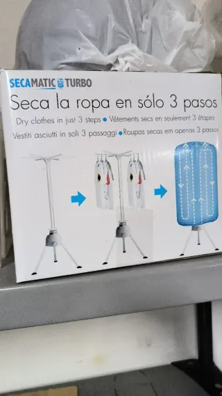 Esto es una secadora de ropa portátil Secamatic Turbo. Sus características clave incluyen: Secado sin fricción, que prolonga la vida útil de la ropa. Utiliza aire caliente a 65°C para eliminar virus y bacterias. Alta capacidad, permitiendo secar hasta 10 kg de ropa. Cuenta con un temporizador ajustable de hasta 180 minutos. Es portátil y fácil de montar y desmontar.