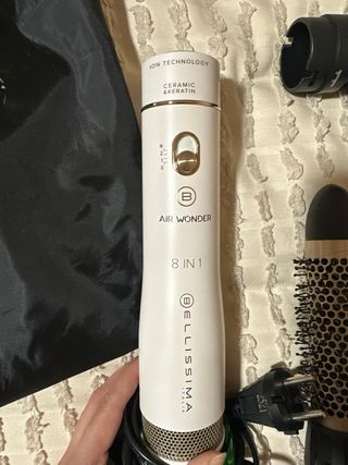 Set de moldeador de pelo con varios accesorios para diferentes estilos. - Incluye secador, cepillos redondos, difusor - Diseño en color blanco y negro con detalles metálicos.