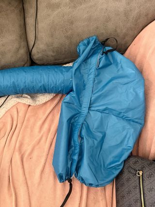 Secador de pelo para perro mediano, ideal para el cuidado de tu mascota. Se pone como si fuera una chaqueta, metiendo las patas. Tiene un tubo que se ajusta al secador de pelo. Sin estrenar
