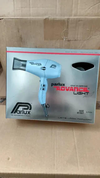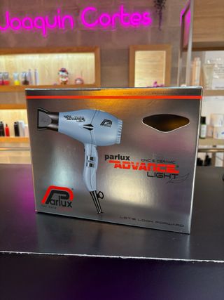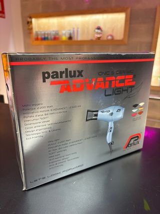 Secador de pelo Parlux Advance Light, con tecnología iónica y cerámica. Diseñado para uso profesional. - Potencia: 2500 W. - Caudal de aire: 83 m³/h. - Voltaje: 220-240 V. - Fabricado en Italia.