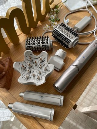 Set completo de accesorios para el Dyson HS05 Airwrap. - Incluye el cuerpo principal del secador y moldeador. - Dos barriles de 30mm. - Dos cepillos voluminizadores. - Cepillo redondo. - Accesorio de pre-estilizado. - Caja de almacenamiento.