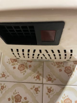 Calefactor eléctrico diseñado para secar humedades. - Color negro. - Asa de transporte. - Dos diales de control en la parte superior.