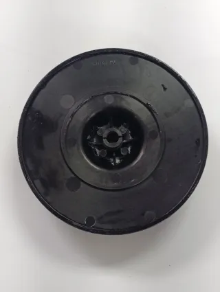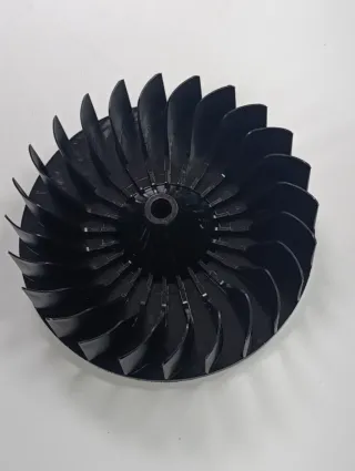 Turbina de repuesto para secadora Indesit. Pieza negra con aspas. 15 cm de diámetro y 3,8 cm de gruesa - Diseño en espiral. - Centro con orificio para eje.