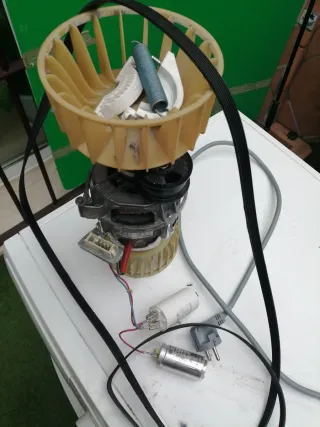 Conjunto de motor, correa y tensor para secadora. - Motor eléctrico. - Correa de transmisión. - Tensor de correa. - Condensador eléctrico.