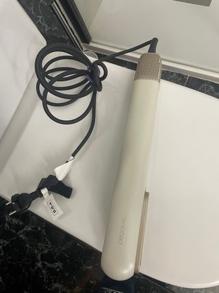 Plancha secador de la marca Cecotec en color blanco y detalles dorados. El cable es negro y tiene un enchufe europeo. - Diseño elegante. - Cable de alimentación enrollable.