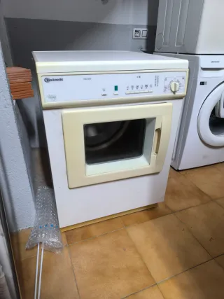 Secadora de ropa Bauknecht en color blanco/beige, carga frontal, funcionamiento correcto. Ideal para piso o segunda vivienda. Fácil de usar, con programas básicos de secado. - Color blanco y panel de control beige. - Puerta con ventana. - Panel de control con dial y botones.