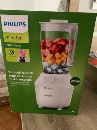 LO VENDO EN MANO POR 20 NUEVO, sin abrir... Batidora Philips 3000 Series en color blanco. Diseñada para mezclas suaves y sin grumos en 45 segundos gracias a su sistema ProBlend. - Potencia de 450W. - Sistema ProBlend. - Garantía de 2 años. Precio nuevo 40