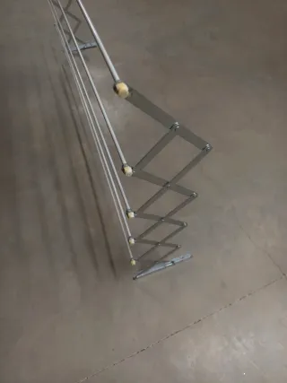 Tendedero de ropa extensible con cuerdas. - Estructura metálica blanca. - Diseño plegable tipo tijera. - Se fija a la pared.