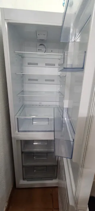 Nevera de la marca Hyundai en color blanco. Diseño moderno y funcional. - Puerta superior y cajón inferior. - Acabado liso y elegante.