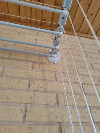 Tendedero extensible para instalar en pared o techo. Ofrece hasta 6 metros de espacio para tender. - Estructura de metal blanco. - Sistema de cuerdas retráctiles. Cada barra mide 1 metros y bajan individuales Incluye un gancho para subir y bajar las barras, un enganche de 6 ganchos para las cuerdas. Pregunta para envío, no lo he puesto aún porque no sé cuanto medirá la caja.