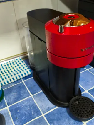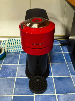 Cafetera Nespresso de color rojo brillante. Su diseño moderno y compacto la hace ideal para cualquier cocina. - Acabado exterior liso y brillante. - Detalle cromado en la parte superior. - Marca Nespresso visible.