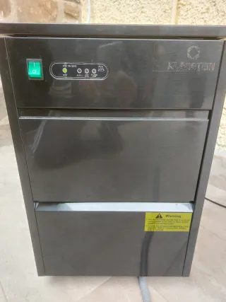 Máquina de hielo Klarstein de acero inoxidable. - Indicadores LED para funcionamiento, fallo, nivel de hielo y nivel de agua. - Interruptor de encendido/apagado. - Incluye etiqueta de advertencia para el primer uso y mantenimiento.