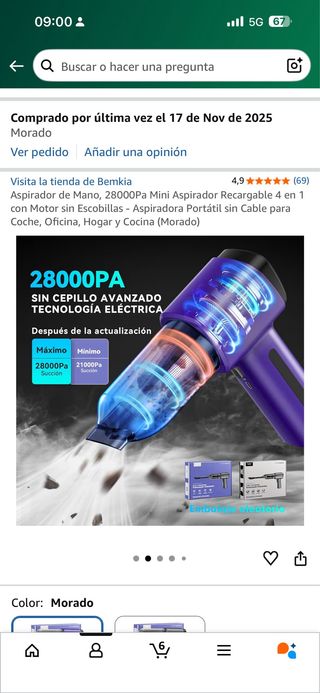 Aspirador de mano Bemkia, modelo 28000Pa, recargable y 4 en 1. Ideal para el coche, oficina, hogar y cocina. - Motor sin escobillas. - Portátil y sin cable. - Color morado.