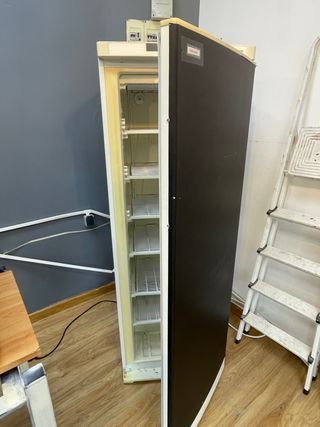 Congelador vertical con varios estantes interiores. - Diseño alto y estrecho. - Puerta de color oscuro.