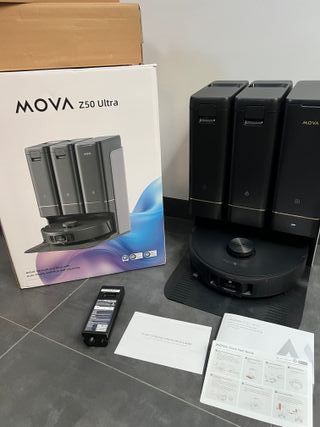 Aspiradora robot MOVA Z50 Ultra con base de autolimpieza y carga. Mova Z50 ultra Robot Aspirador 19000Pa Gran potencia de Succión con mopa de rodillo giratoria (mejor que las giratorias convencionales ya que no deja marcas), mopa giratoria lateral para llegar a rincones, cepillo con brazo extensible. Limpieza con Agua Fresca y 18N Presión, Autolimpieza con Agua Caliente 75°C, Mopa Levantable, Navegación DToF+IA RGB, Autovaciado. En muy buen estado, muy poco uso. Incluye caja original y sus accesorios, como nueva, como se ve en fotos. No negociable
