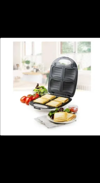 Máquina versátil para preparar sándwiches, gofres y asados a la parrilla. Incluye varios juegos de placas intercambiables para diferentes preparaciones. - Placas para gofres. - Placas para parrilla. - Placas para sándwiches.