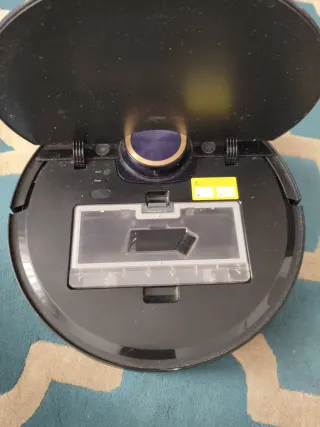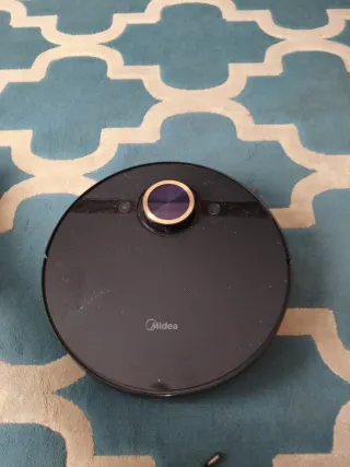 Robot aspirador de la marca Midea. Diseñado para facilitar la limpieza del hogar. - Color negro. - Tapa superior abatible. - Compartimento para polvo.