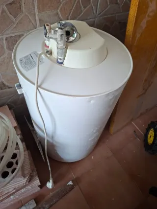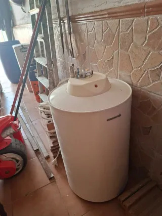 Termo eléctrico de la marca SKYLUXE, ideal para calentar agua. - Diseño cilíndrico blanco. - Indicador de temperatura visible. - Etiqueta de información del producto. - 50 litros. Aún en garantía, se compró en mayo de 2024. Apenas usado solo 6 meses. Se vende por jubilación en el negocio.