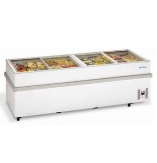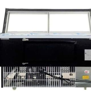 Nevera expositora para hostelería con puerta corredera. - Diseño moderno en color negro. - Estantes interiores para exhibición. - Panel frontal con información de producto.