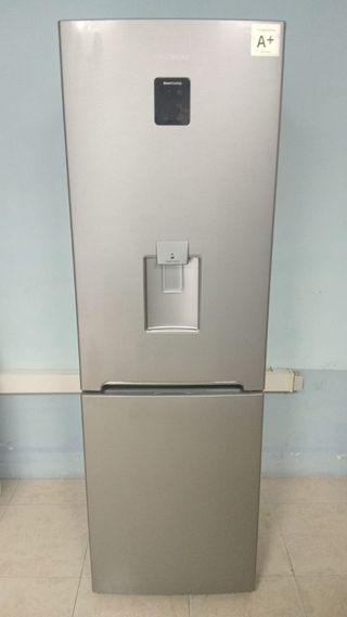 Nevera de color plateado con un diseño moderno. - Compartimento superior. - Compartimento inferior. Con tres meses de garantia