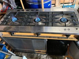 Cocina industrial de gas con tres fuegos y horno, ideal para negocios de hostelería o cocinas amplias. Funciona con butano. - Tres quemadores de alta potencia. - Horno espacioso. - Fabricada en acero inoxidable.