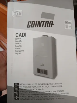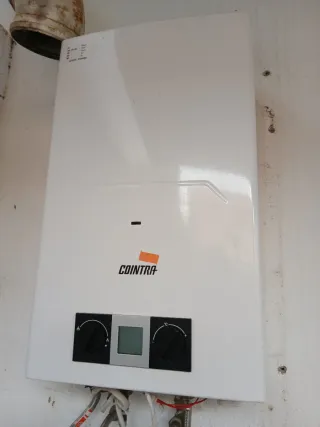 Calentador de agua a gas de la marca COINTRA. Diseño moderno y compacto. - Panel de control con pantalla digital. - Mandos giratorios para ajuste de temperatura y potencia. - Indicador de llama. Año de compra 2023, funciona correctamente. Hemos cambiado a Calentador Electrico