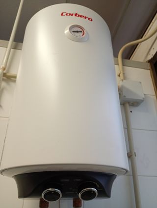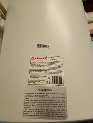 Termo eléctrico de la marca Corbero, ideal para calentar agua. - Color blanco. - Diseño cilíndrico vertical. - Indicador luminoso. Se vende por sustitución por uno mas grande RECOGIDA Y TRANSPORTE A CARGO DEL COMPRADOR