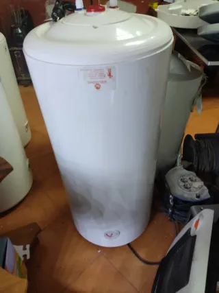 Termo eléctrico con capacidad de 50 litros. Está como nuevo, con muy poco uso. - Color blanco. - Diseño cilíndrico vertical. - Conexiones de fontanería visibles.