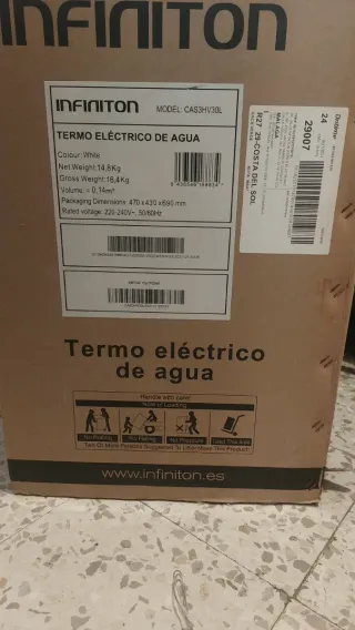 Termo eléctrico de agua de la marca INFINITON, modelo CAS3HV30L. - Color: Blanco. - Peso neto: 14,8 Kg. - Peso bruto: 16,4 Kg. - Volumen: 0,14 m³. - Dimensiones del embalaje: 470 x 430 x 690 mm. - Voltaje: 220-240V~, 50/60Hz.
