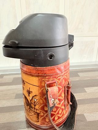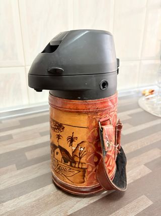 Termo con funda de cuero artesanal, ideal para disfrutar de tereré y mate. - Diseño con paisaje grabado en cuero. - Funda de cuero con detalles. - Tapa superior negra.