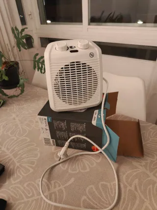 Calefactor eléctrico blanco con dos niveles de potencia y termostato. - Potencia máxima de 2000W. - Dos intensidades de calor seleccionables. - Termostato regulable para mantener la temperatura deseada.