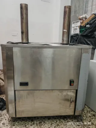 Fogón para churrería a gas con caldera incorporada y termostato.80x80 altura 80 con ruedas con freno - Fabricado en acero inoxidable. - Dos salidas superiores. - Panel de control digital. - Puerta inferior de acceso.
