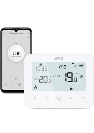 SPC Vesta Thermostat – Termostato calefacción WiFi para Caldera de Gas, manejo Inteligente por App, Compatible con Alexa/Google, detección de Ventanas Abiertas, programable y de Pared – Blanco Marca SPC Nombre del modelo Vesta Thermostat Dimensiones del producto 2,3f. x 12,5an. x 9,8al. centímetros Tipo de controladorAsistente de Google, Amazon Alexa Función especial Bloqueable, Programable, Sensor de ventana, Regulable, Programación automática Color Blanco
