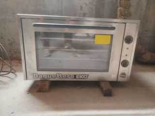 Horno baguettero convencional, de acero inoxidable para hornear productos de panaderia. Con cuatro bandejas de alumino perforado de 60x40 cm. Dos motores con inversor de marcha, apertura de puerta de seguridad en dos tiempos, con puerta de vidrio para poder ver el interior mientras se hornea. Cuenta con controles de temperatura y tiempo en el panel frontal, regulacion del termostato electromecanico de 50-300 oC Posibilidad de monofasico y trifasico. En muy buen estado, apenas utilizado. Peso 62 KG aprox. - Marca: EKG - Modelo: Baguettero
