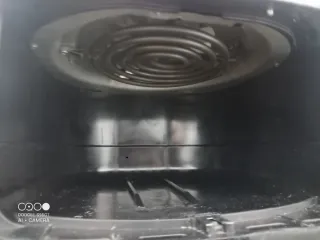 Cecotec Freidora de aire para cocinar si apenas aceite. Cubeta de 2,5 L de capacidad, 1200 W . Tecnología PerfectCook de aire caliente que circula por el interior y sale por los orificios traseros. Dispone de termostato para regular la temperatura desde 80ºC hasta 200 ºC. Tiempo ajustable de 0 a 30 minutos. Con protección contra sobrecaliento. Luz indicadora de funcionamiento. Base antideslizante para favorecer su apoyo durante el funcionamiento. Carcasa y asa de tacto frío. En perfecto estado. Solo que la parrilla interior está algo rayada de los lavados tras el uso.