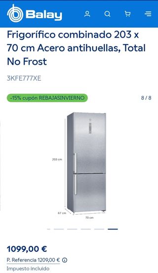 Frigorífico combi Balay en acabado acero inoxidable. - Modelo: 3KFE777XE - Medidas: 203 cm (alto) x 70 cm (ancho) x 67 cm (fondo) - Tecnología Total No Frost - Acero antihuellas Dos años de uso, lo vendo porque no cabe en mi cocina nueva.