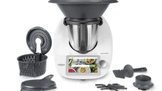 Robot de cocina Thermomix TM6 en color blanco. Incluye varios accesorios. - Jarra de acero inoxidable. - Cesta. - Varoma. - Espátula. - Mariposa.