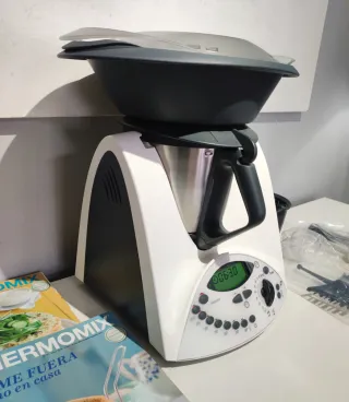 Robot de cocina Thermomix TM31 en color blanco. - Panel de control con pantalla digital. - Selector de velocidad y turbo. - Indicadores luminosos de temperatura. Contiene todos sus accesorios. Valora con dos bandejas y su tapadera. Vaso, cuchilla, mariposa, cestillo, cubilete, etc.. Realiza todas las funciones, incluye peso, solo puedo destacar que cuando haces alguna masa fría, solo a veces se va subiendo la temperatura. Pero por lo demás, realiza su función perfectamente, la vendo porque he comprado el modelo nuevo.