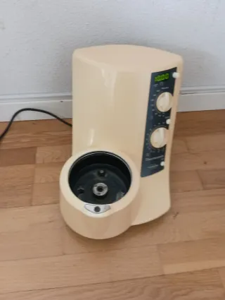 Base para Thermomix TM-21. Enciende y funciona el botón de ajuste de tiempo. Al girar el botón de mover las cuchillas suenan 3 pitidos y no hace nada. Es para piezas. NO FUNCIONA. - Color crema. - Panel de control con diales y pantalla digital.