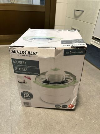 Heladera SilverCrest Kitchen Tools para preparar hasta 1 litro de helado o sorbete. Usada solo una vez, está en perfecto estado y funciona correctamente. La vendo porque me compré la Thermomix y ya no la utilizo. Se entrega con su caja original y la garantía que le queda año y medio. - Incluye 6 recetas. - Potencia de 12W. - Longitud del cable: 150 cm.