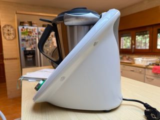 Máquina de cocinar Vorwerk Thermomix en color blanco. Dispone de pantalla digital y varios botones de control. - Selector de temperatura con rangos de 37 a 100 grados. - Botones de control de tiempo y velocidad. - Función Turbo. Viene con todos los accesorios.