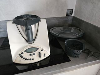 Se vende Thermomix TM5 en buen estado, con todos sus accesorios. Y algunos más de regalo, como consta más abajo. -Cook-key. (valorado en 129€) con tres libros de recetas incorporados. - Dos Jarras de acero inoxidable. - Cesta. - Varoma. - Espátula. - Mariposa. - Dos Tapas. - Dos Cubiletes. - Dos cuchillas. - La tapa del varora, presenta un leve fallo estético, que no afecta para nada en su funcion, ya que lo apoyamos sin querer en la vitro, (Se puede apreciar en la última foto). Se vende por adquisición del nuevo modelo. Funciona perfectamente.
