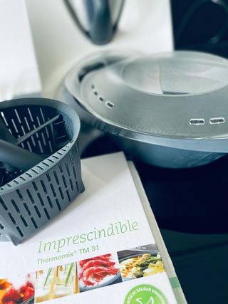 Robot de cocina Thermomix TM31 funcionando en perfecto estado. - Incluye vaso, tapa, 2 cuchillas, mariposa, espátula, cestillo y varoma. - Se incluyen 6 libros de recetas: el imprescindible, tres de las presentadoras, 40 años innovando y Navidades juntos - panel de mandos nuevo. -cuchilla en uso prácticamente nueva. - espátula nueva