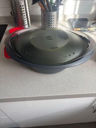 Accesorio Varoma para tu robot de cocina Thermomix. Ideal para cocinar al vapor. - Material: Acero inoxidable y plástico. - Diseño con perforaciones para cocción uniforme.