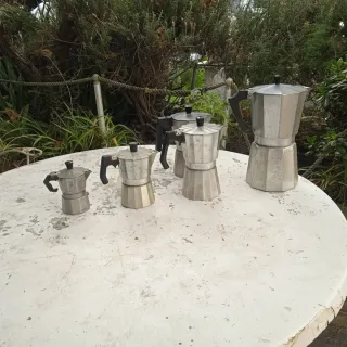 Conjunto de cinco cafeteras italianas de aluminio, de diferentes tamaños. - Fabricadas en aluminio. - Diseño clásico de cafetera italiana. - Ideales para preparar café de forma tradicional. Vendo el lote completo y el precio es por el lote,todas funcionan,y tanto para colección ,como uso diario