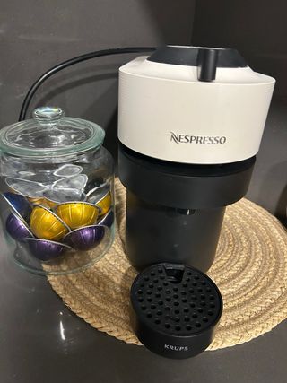 Cafetera Nespresso Vertuo Krups en color blanco. Ideal para preparar tu café favorito. - Diseño moderno y compacto. - Incluye cápsulas de café variadas.