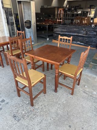 - TELEFONO: 651559055 Conjunto de mesa y cuatro sillas de madera, ideal para comedor o cocina. El diseño es clásico y atemporal. - Mesa de madera oscura. - Estructura de madera robusta. - CANTIDAD: 13 juegos - MEDIDAS MESAS: 0,80x0,80x0,75 alto - MEDIDAS SILLAS: 0,40x0,40x0,46 alto - HACEMOS ENVIOS - PRECIO POR JUEGO