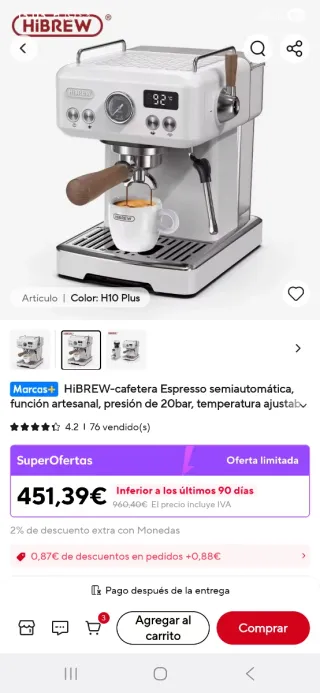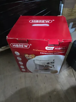 Cafetera espresso semiautomática HiBREW en color blanco. Cuenta con función artesanal y pantalla digital. NUEVA SIN USAR - Presión de 20 bares. - Temperatura ajustable. - Diseño moderno con detalles en madera.