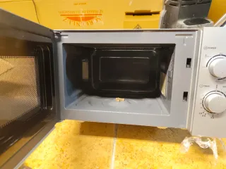 Microondas de la marca Saivod, modelo MSG-2819S, en color plata. Cuenta con un diseño moderno y compacto. De 20 litros. - Panel de control con dos mandos giratorios. - Puerta con ventana para visualizar el interior. - Asa integrada para abrir la puerta.
