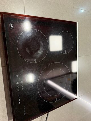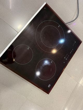 Placa de inducción de la marca AEG Electrolux con tres zonas de cocción. Modelo 68101KF-AN Funciona perfectamente ! Cristal SIN rotura pero con signos de uso - Diseño moderno y elegante. - Controles táctiles intuitivos.